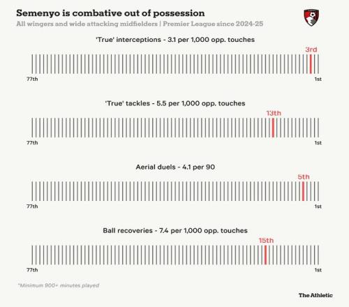 在防守方面,与许多英超顶级边锋相比,他在无球跑动和压迫时的表现也相当出色。作为伊劳拉麾下高位压迫体系的一部分,塞门约更像是一个主动出击型的防守者,旨在从触球过重或靠近己方禁区时未观察周围情况的对手脚下断球。