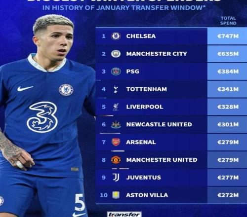 冬窗开启已经有一段时间了,德转也统计了历史冬窗各个俱乐部的累计支出,切尔西以7.47亿欧元支出排名榜首,前十名中英超俱乐部占据了八席。